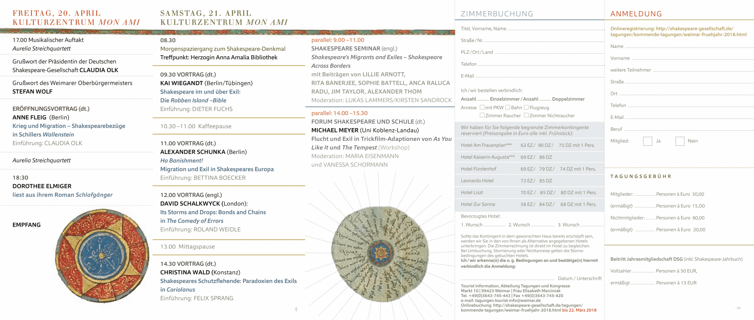 Die Shakespeare-Tage vom 20. bis 22. April 2018 in Weimar sind dem hochaktuellen Thema „Flucht – Migration – Exil“ gewidmet. In den wissenschaftlichen Vorträgen geht es zum einen um Flucht, Migration und Exil in Shakespeares Stücken (etwa in den Romanzen), zum anderen aber auch um die Migration dieser Dramen selbst, um Shakespeare als globales, in immer neuen Kontexten und Medien adaptierbares Phänomen.