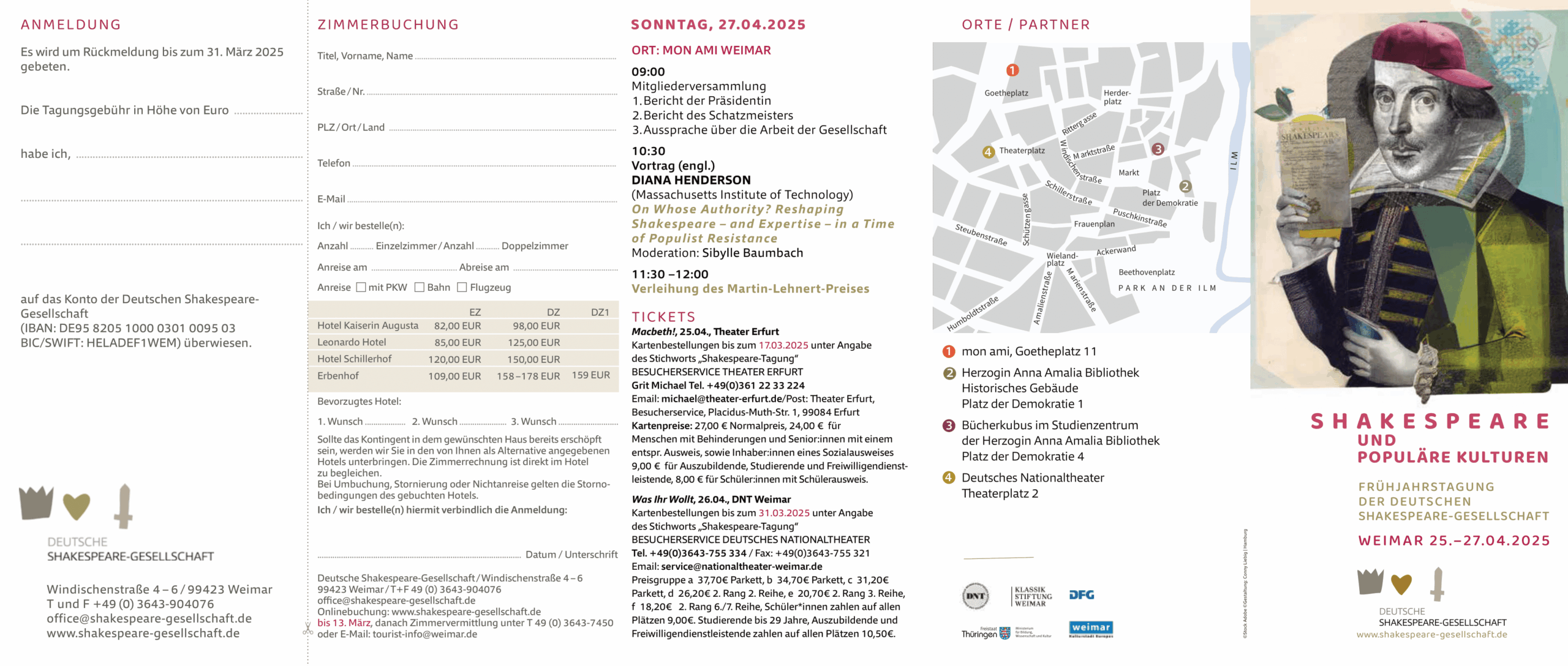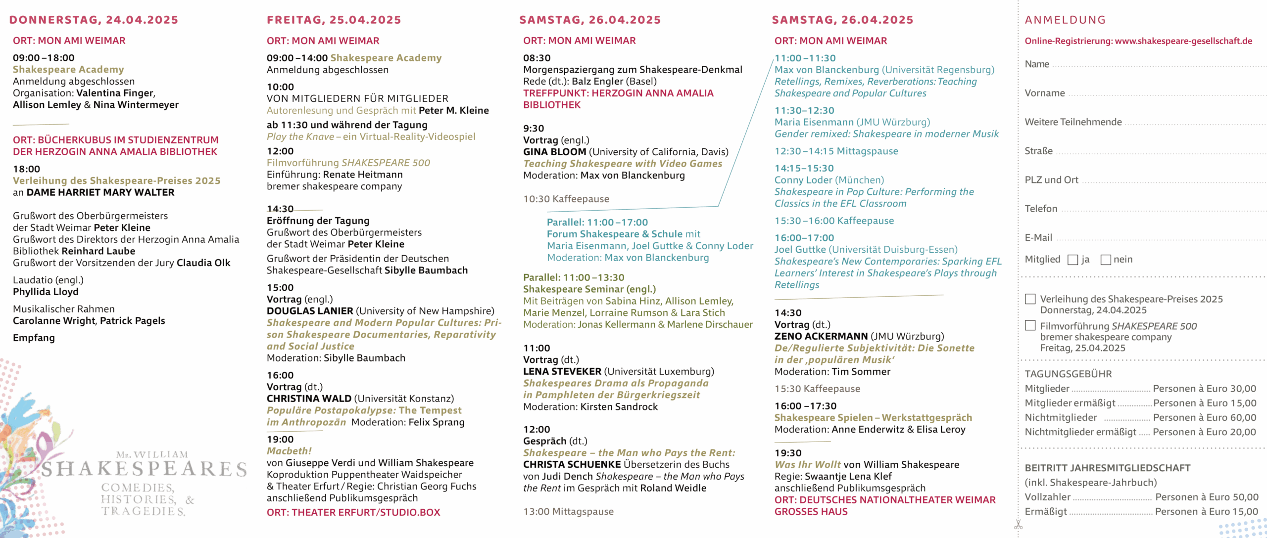 The Spring Conference centres on the topic Shakespeare and Popular Cultures and will be taking place from 25-27 April 2025 in Weimar. On the evening before the official beginning of the conference, on Thursday, 24 April, the award ceremony of the German Shakespeare Prize will take place at 6 pm in the ‘Bücherkubus’ of the Anna Amalia Library.